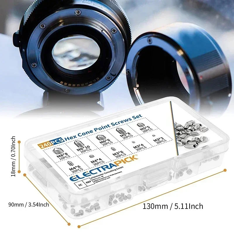 Different sizes: M3 x 3mm, M3 x 4mm, M3 x 6mm, M4 x 4mm, M4 x 6mm, M5 x 5mm, M5 x 8mm, M6 x 6mm, M6 x 10mm, M8 x 8mm, 240 pieces in total to meet different needs. It is an indispensable tool for home crafts.