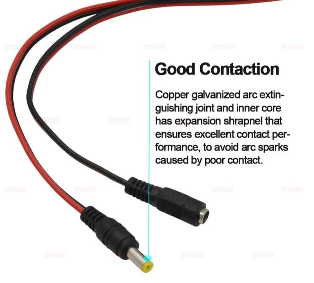 Connector polarity: internal positive + (red wire); external negative-(through black wire)