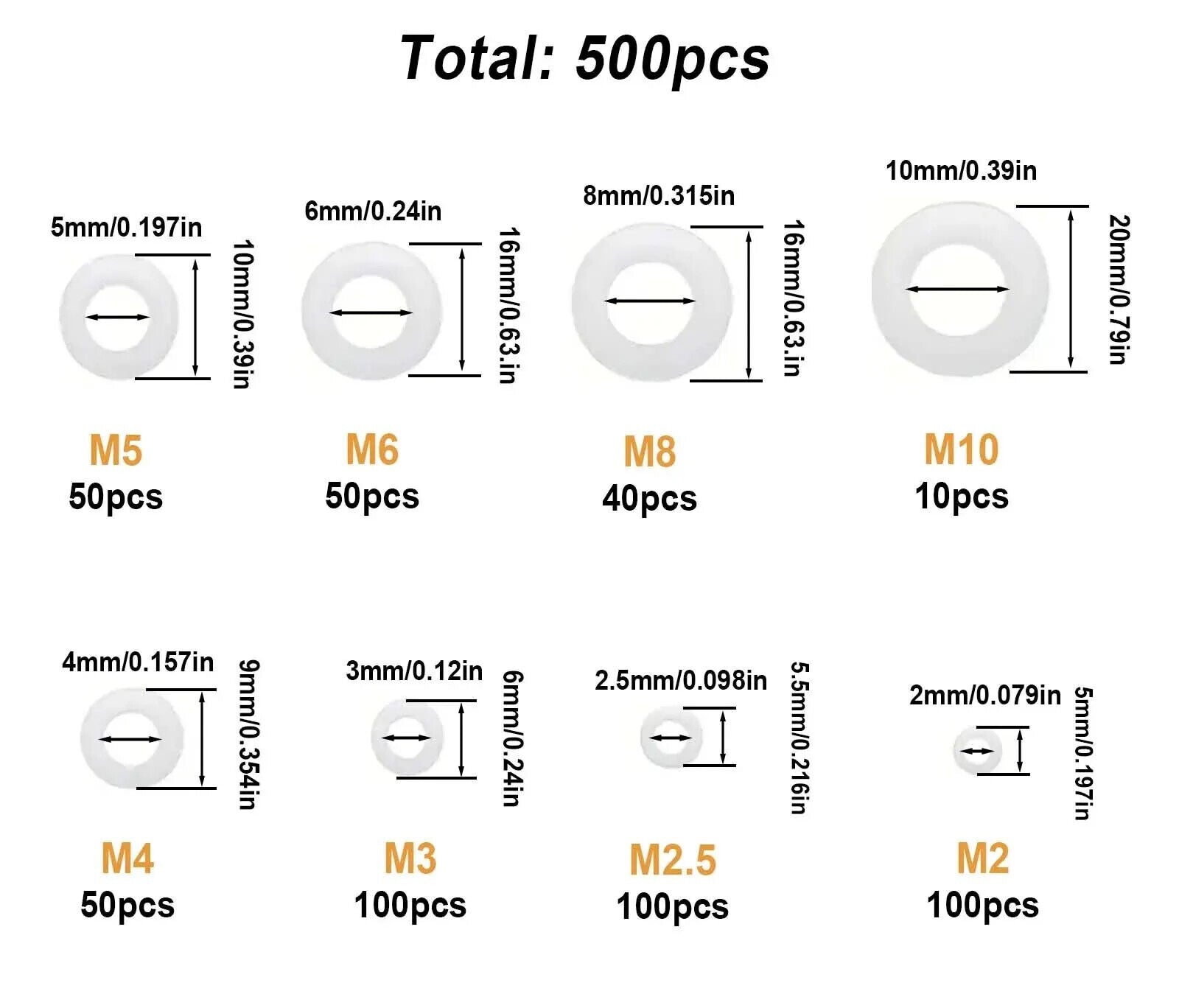 500 x FLAT NYLON WASHER SET, M2 M2.5 M3 M4 M5 M6 M8 M10 WHITE GASKET PLASTIC