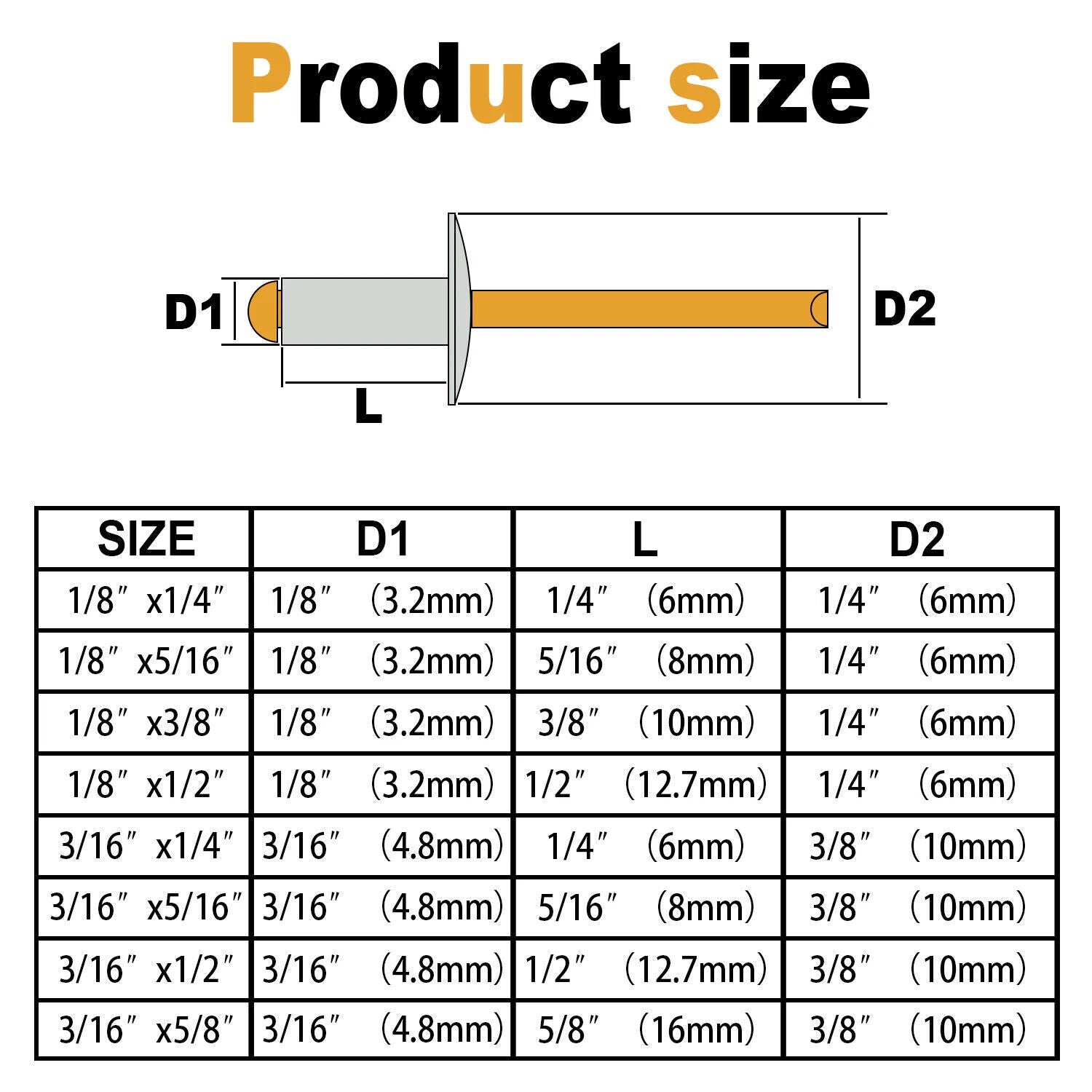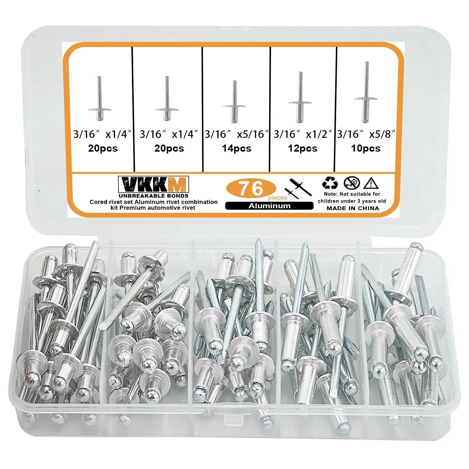 Product content :3/16 inch *1/4 inch /40pcs (4.8mm*6mm) 3/16 inch *5/16 inch /14pcs (4.8mm*8mm) 3/16 inch *1/2 inch /12pcs (4.8mm*12.7mm) 3/16 inch *5/8 inch /10pcs *16mm (4.8 mm) Package includes: 76 pieces in 4 sizes.